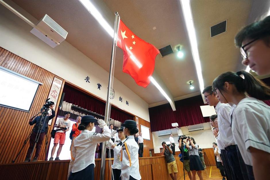 ? Cela m'attriste de voir toute la controverse et les troubles qui se sont déroulés à Hong Kong au cours de l'été. Les jeunes qui ont jeté un drapeau national à la mer doivent avoir un très faible respect pour le drapeau et le pays. La cérémonie d'aujourd'hui est importante. Cela leur apprend à respecter le pays ?, a-t-il déclaré devant une salle pleine. ? Nous ne pouvons avoir un foyer s?r et un endroit agréable pour étudier que lorsque nous avons une nation forte derrière nous. Pour que Hong Kong se développe, elle doit s'intégrer dans l'image globale de la nation chinoise et c'est la voie que doivent suivre les jeunes de Hong Kong pour réussir dans l'avenir ?, a-t-il affirmé.