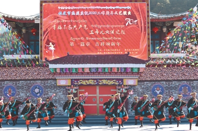 En photo : à Nyingchi au Tibet, les gar?ons en costumes Kongpo chantant et dansant devant le public dans un spectacle culturel et artistique du Nouvel An de Kongpo.