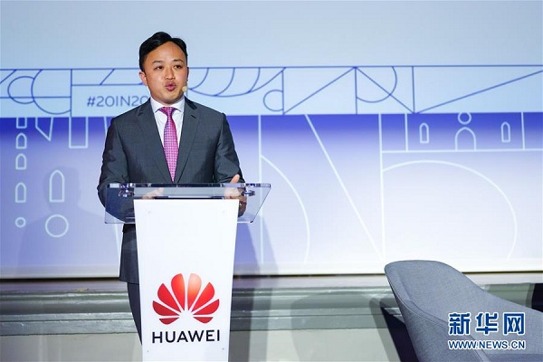 Le 4 février, Liu Kang, responsable des affaires pour l'Europe du géant chinois des télécommunications Huawei, prononce un discours lors d'une réception organisée à l'occasion du Nouvel An chinois à Bruxelles. (Photo : Zhang Cheng/Xinhua)