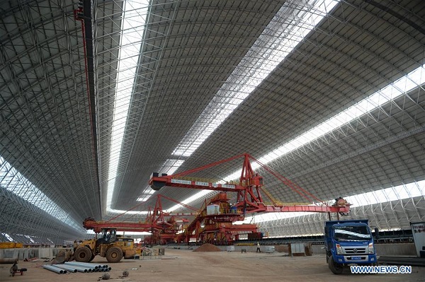 Photo prise le 16 avril 2020 montrant un entrep?t de vrac en forme de ? capsule ? à Yueyang, dans la province du Hunan (centre de la Chine). Les constructeurs ont terminé la pose du toit du projet. L'entrep?t, qui mesure environ 470 mètres de long et 110 mètres de large et 46,5 mètres de hauteur, devrait être mis en service de manière plus respectueuse de l'environnement le 25 avril.