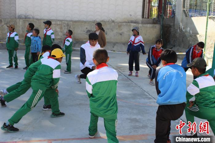 Des élèves de la troisième école élémentaire du district de Sangzhuzi, dans la ville de Shigatsé, au Tibet, en train de s'échauffer sous la direction d'un entra?neur d'escalade.