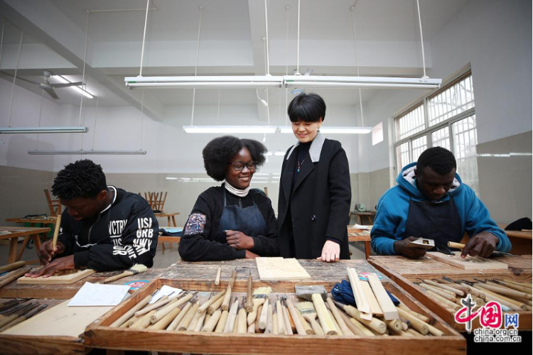 Photo prise le 25 janvier, montrant des étudiants congolais en train d'apprendre la sculpture sur bois, au Zhejiang Guangsha Construction Vocational Technology College, situé à Dongyang, dans la province du Zhejiang(est). Un total de 21 étudiants congolais ont décidé de rester à Dongyang pour les vacances d'hiver et la fête du Printemps. L'université a ouvert des cours supplémentaires sur la culture chinoise pour enrichir leur séjour à l'université.