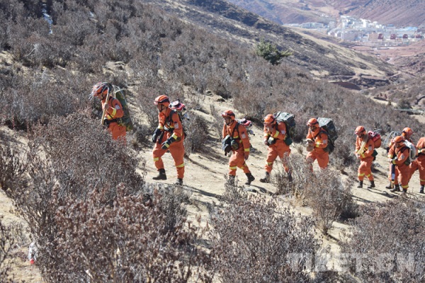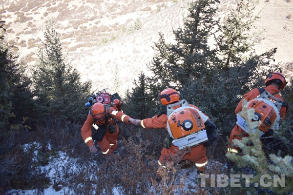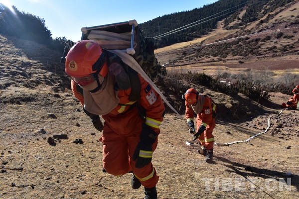 Les commandants et les membres de la division Mangkam de l'escadron de lutte contre les incendies de forêt du district de Zogang en train de s'entraider.