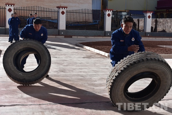 Les commandants et les membres de la division Mangkam de l'escadron de lutte contre les incendies de forêt du district de Zogang en train d'effectuer un entra?nement physique.