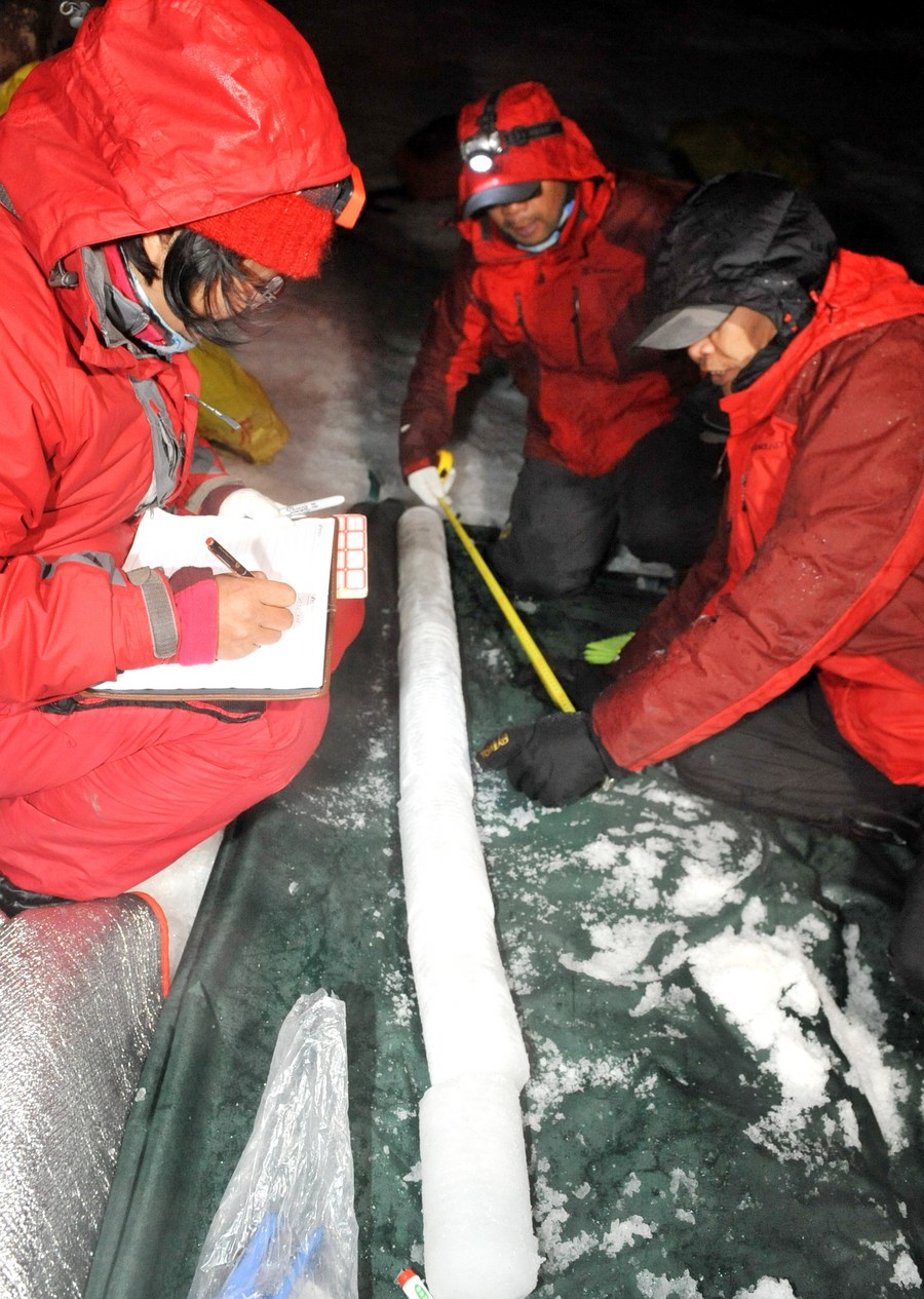 Photo d'archives de chercheurs mesurant une carotte de glace. (Photo : Xinhua)