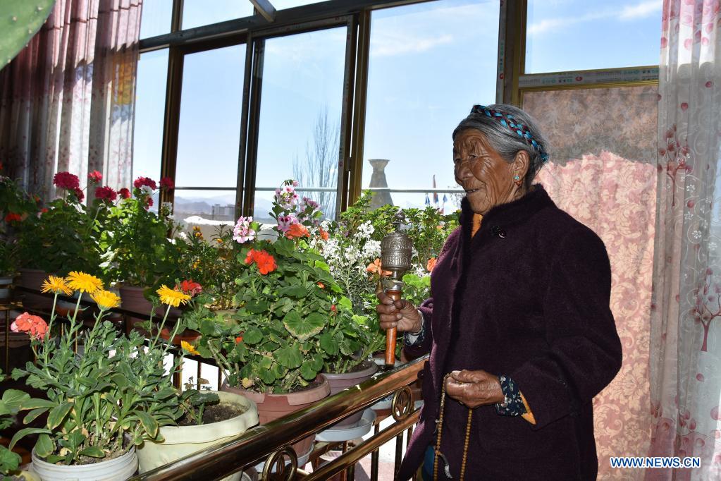 Photo montrant Penpa Tsamjo chez elle dans une résidence de Shigatsé, dans la région autonome du Tibet (sud-ouest de la Chine), le 27 mars 2020. (Liu Hongming / Xinhua)