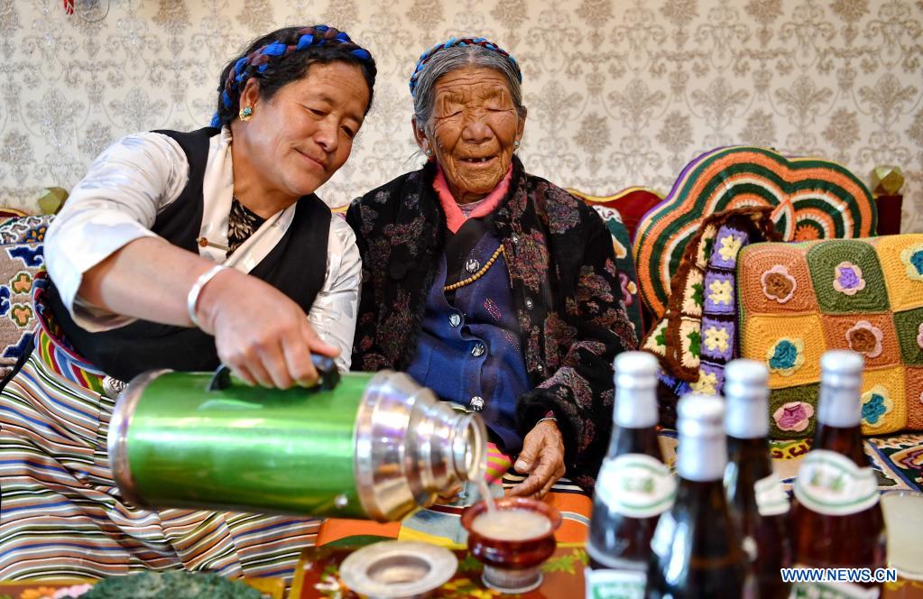 Penpa Tsamjo (à droite) re?oit une tasse de thé de sa voisine à Shigatsé, dans la région autonome du Tibet (sud-ouest de la Chine), le 19 mars 2021.