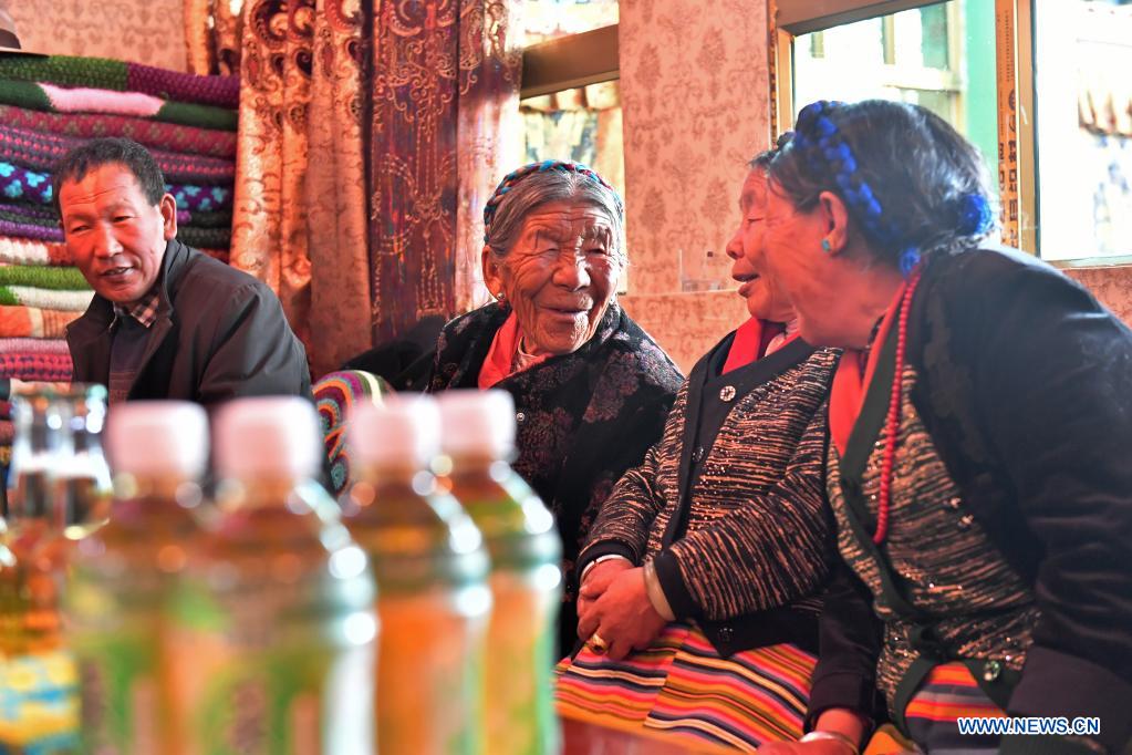 Penpa Tsamjo (2e à gauche) discute avec ses voisins à Shigatsé, dans la région autonome du Tibet (sud-ouest de la Chine), le 19 mars 2021.