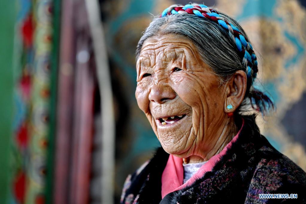 Penpa Tsamjo, 92 ans, est une habitante de la résidence Bomuqing à Shigatsé. Dans l'ancien Tibet, la famille de Penpa Tsamjo était serfs depuis des générations. Quand elle était enfant, Penpa Tsamjo entretenait la forêt pour les propriétaires de serfs et n'avait pas suffisamment de nourriture pour vivre. Aujourd'hui, Penpa Tsamjo a une famille de quatre générations et jouit enfin d'une vie heureuse à son grand age.