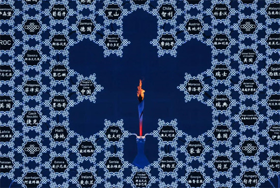 Dans la nuit du 4 février, Dinigeer Yilamujiang et Zhao Jiawen, athlètes chinois des sports de neige et de glace nés dans les années 2000, ont été les derniers porteurs de la flamme dans le Nid d'oiseau. Derrière eux, une structure représentant un flocon de neige géant qui réunit 91 délégations aux JO et symbolise leur solidarité brille de mille feux.