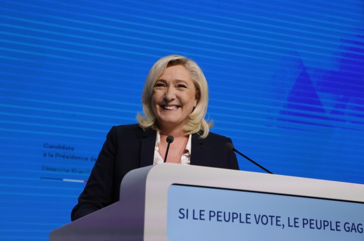 La candidate d'extrême droite Marine Le Pen prend la prole lors d'un rassemblement après le premier tour de l'élection présidentielle de France, à Paris, capitale fran?aise, le 10 avril 2022. (Xinhua/Rit Heize)