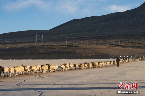 Le 3 février, dans le village de Tuiwa de la ville de Shannan, dans la région autonome du Tibet (sud-ouest de la Chine), plus de 1 400 moutons ont traversé le lac glaciaire de Pumuyongcuo à destination de l'?le de Huxin. En effet, du fait de la haute altitude et de l'été court dans le village de Tuiwa, il n'y a pas assez de fourrage dans les prairies pour que les moutons puissent passer l'hiver. C'est pourquoi, chaque année, lors de la période la plus froide du plateau, les bergers de ce village ont l'habitude de mener leurs troupeaux vers l'?le de Huxin où il y a de l'eau et des prairies abondantes. Ici les moutons peuvent passer la plus froide période à l'aide du fourrage.