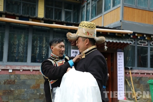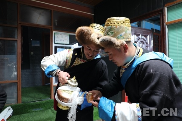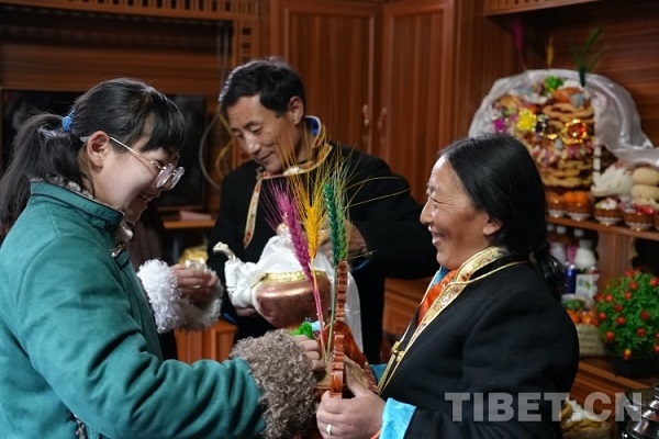 Dans le village de Niulintang, canton de Yulmed, Lozang Tashi, le secrétaire de la branche du Parti du village, était également vêtu de costumes. Lui et les villageois ont apporté la bo?te Qiema chez des voisins pour se rendre visite, se présentant des hada et se servant du Qiema. Tous les foyers du canton de Yulmed ont ri avec joie, célébrant ensemble le Nouvel An tibétain joyeux et propice !