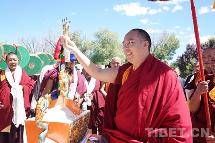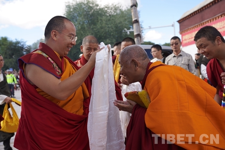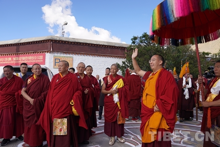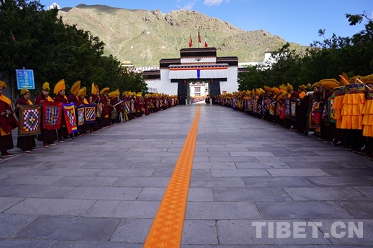 Après l'arrivée du panchen Rinpoche et de son cortège, avec de la fumée des pins et des cyprès flottant dans l'air et les cornes de dharma résonnant longuement, les représentants des moines éminents du monastère de Tashilhunpo ont offert un khata au panchen Rinpoche en signe de respect. Et ce dernier a salué les moines et les croyants qui l'attendaient en agitant la main. Ensuite, guidé par les moines tenant un parasol jaune et un encensoir, le panchen Rinpoche s'est dirigé lentement vers la grande salle de Tsochen à travers la grande cour de Duojia du monastère.