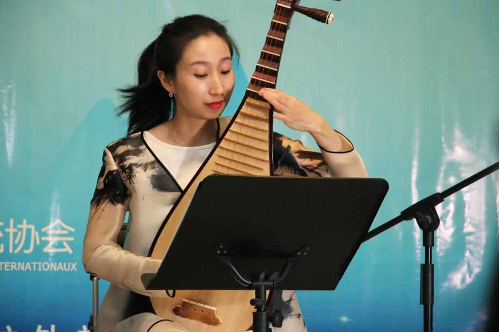 Une artiste du luth pipa interprète un morceau de musique pendant le concert du Festival de la mi-automne au Centre culturel chinois de Cotonou, au Bénin, le 23 septembre 2023. (Xinhua/Seraphin Zounyekpe)