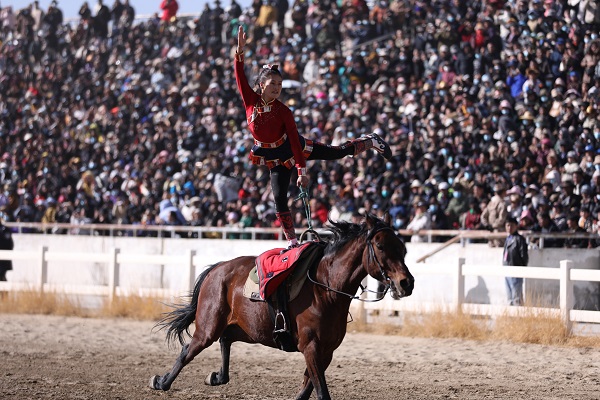 Tenant un hada blanche à la main, portant de beaux vêtements tibétains, des athlètes équestres montés à cheval offrent au public un festin visuel de vitesse et de beauté.