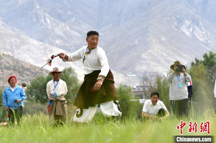 La photo montre des concurrents qui s'affrontent lors d'une compétition d'Uerduo durant la première édition des Jeux sportifs des agriculteurs et éleveurs de Lhassa le 23 juin.