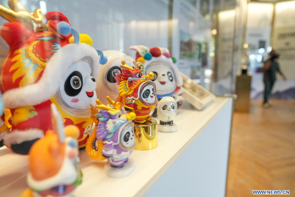 Cette photo prise le 24 juillet 2024 montre diverses versions de Bing Dwen Dwen, la mascotte des Jeux olympiques d'hiver de Beijing 2022, dans la China House à Paris, en France. La China House pour les Jeux olympiques de Paris 2024 a été inaugurée mercredi à l'H?tel Salomon de Rothschild, à Paris. (Xinhua/Ju Huanzong)