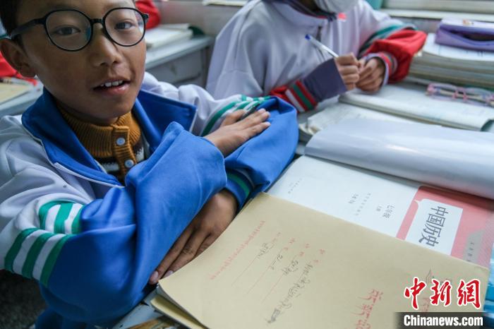 Le 9 septembre, un élève de première année du collège de Nanggarzê au Xizang montre ses manuels d'histoire chinoise et de langue tibétaine.