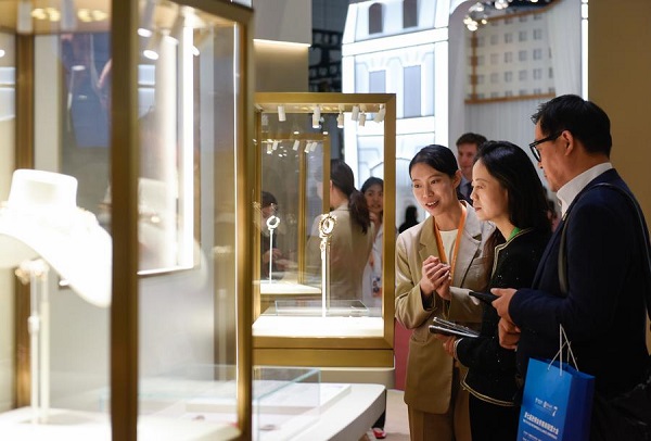 Une employée de Cartier présente des produits aux visiteurs lors de la septième Exposition internationale d'importation de la Chine (CIIE), à Shanghai, dans l'est de la Chine, le 7 novembre 2024. (Photo : Xu Liang)