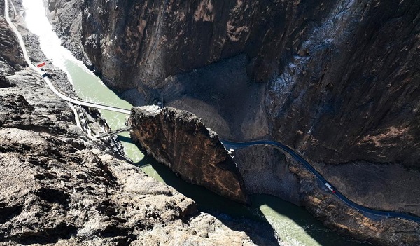 Photo aérienne du pont Nujiang sur la route Sichuan-Xizang, situé dans le district de Baxoi, dans la région autonome du Xizang (sud-ouest de la Chine), le 16 novembre 2024. (Photo : Yang Fan)