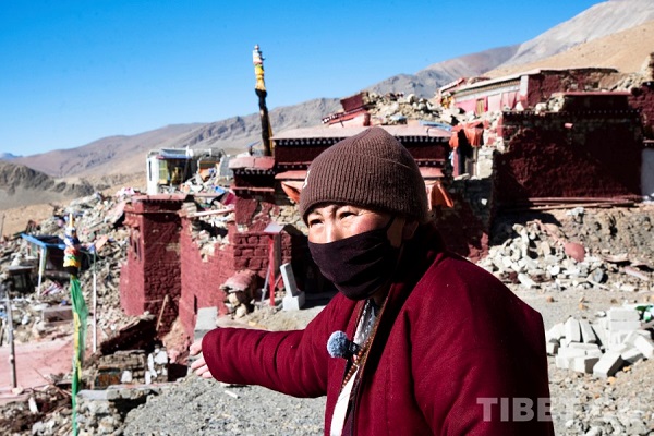 Devant l'entrée du temple de Zongbu, nos journalistes ont rencontré Gonggar Lhaje, récemment sortie de l'h?pital. En contemplant son temple familier, désormais loin de son état d'origine, elle exprime son inquiétude face aux dommages qu'il a subis.