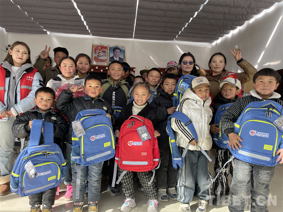 Des bénévoles distribuent du matériel scolaire aux enfants du district de Lhorong, au Xizang.