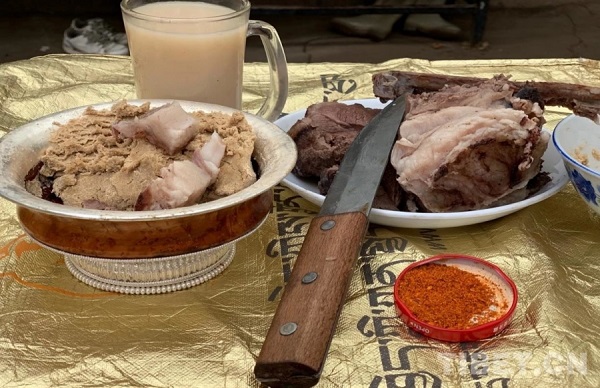 à midi du premier jour de l'an, nous invitons nos voisins et nos proches à la maison. En plus du riz et des légumes, dans les régions pastorales, les h?tes préparent également des têtes de b?uf et de mouton pour accueillir les invités. Les adultes raffolent de la viande, tandis que les jeunes préfèrent les légumes variés. L'après-midi, nous dégustons des racines de potentille ansérine mélangées avec du beurre ainsi que des baozi à la viande.