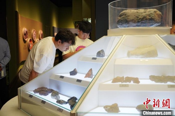 Des visiteurs observent des échantillons de minéraux exposés.