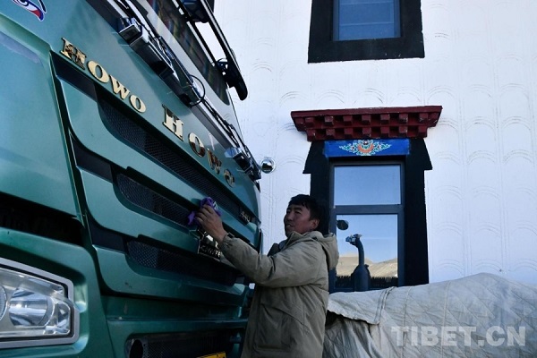 Tenzin Gyalpo en train de nettoyer son nouveau véhicule devant sa nouvelle maison.