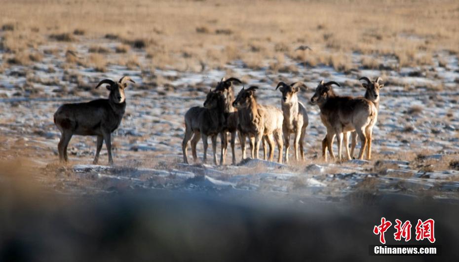 Le 14 février, un mouton bleu regarde au loin sur une colline de la baie de Yanchi dans le district de Subei.