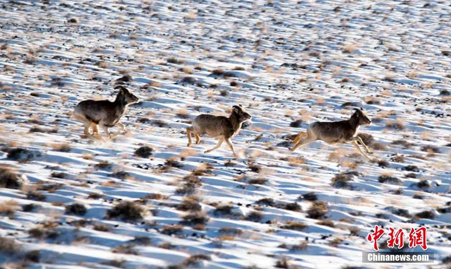 Le 14 février, un groupe d'animaux sauvages paissent librement dans une prairie sous les montagnes enneigées de la Réserve naturelle nationale de la baie de Yanchi.
