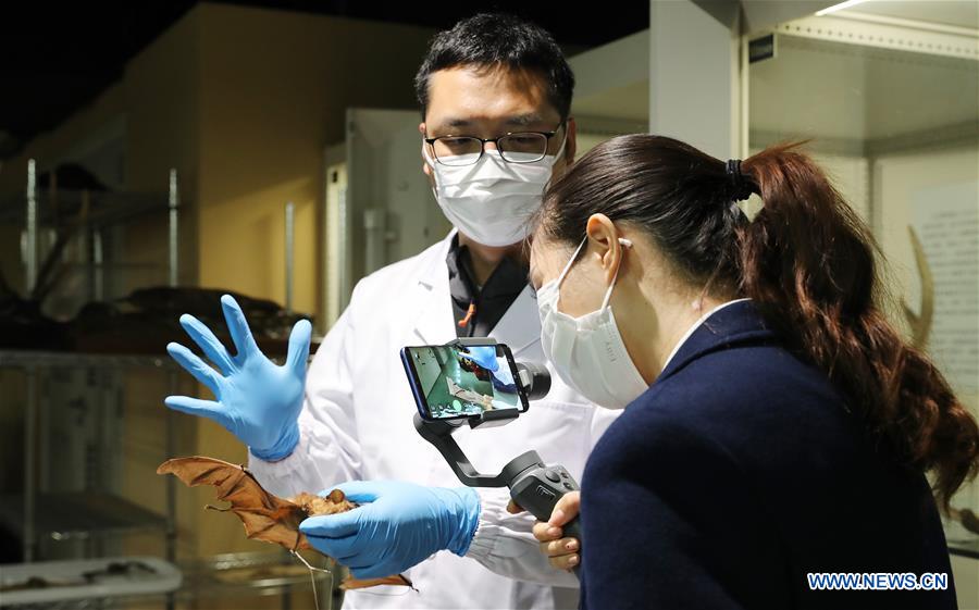 Le Dr Zhang Wei (à gauche) présente la structure corporelle des chauves-souris via une diffusion en direct 5G au Musée d'histoire naturelle de Shanghai (est de la Chine), le 18 avril 2020. Le Musée d'histoire naturelle de Shanghai a organisé le 18 avril une retransmission en direct 5G sur le thème des chauves-souris pour aider les gens à en apprendre davantage sur ces animaux.