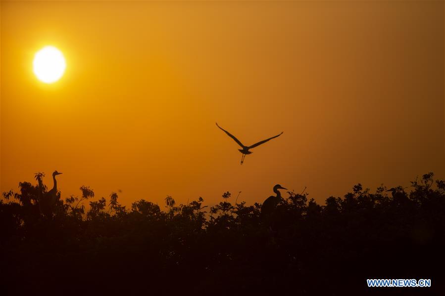Silhouettes de hérons devant le soleil couchant dans une base de conservation des oiseaux migrateurs au bord du lac Poyang, dans la province chinoise du Jiangxi (est), le 9 avril 2020.