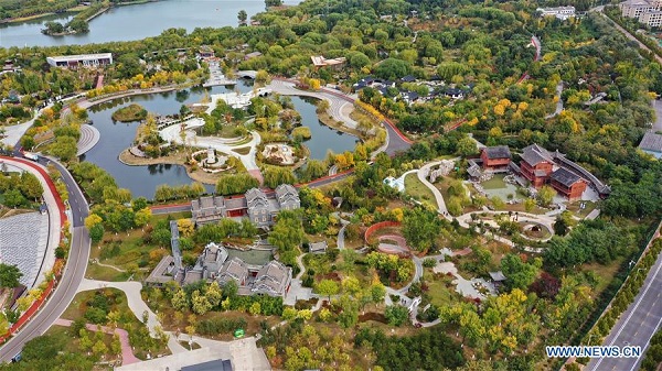 Vue aérienne du site pittoresque de Nanhu, à Tangshan, ville de la province chinoise du Hebei (nord), le 20 octobre 2020. Le site pittoresque de Nanhu a été transformé à partir de la zone d'affaissement de la mine de charbon de Kailuan. (Photo : Mu Yu)
