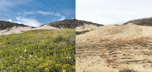 En photo : comparaison de la même pente avant restauration écologique (à droite) et après restauration écologique (à gauche) dans le projet pilote de contr?le du sable et de restauration écologique dans le nouveau district de Konggang.