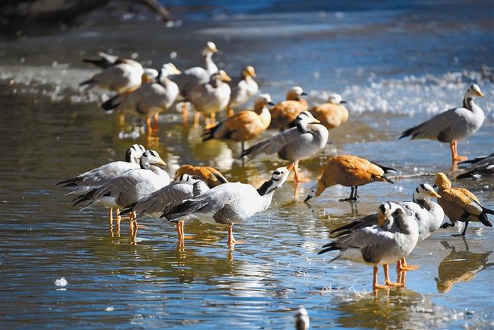 En hiver, le parc Dzongyab Lukhang à Lhassa, au Tibet, s'est transformé en un ? paradis ? pour les oiseaux. Un grand nombre d'oiseaux migrateurs d'hiver sont rassemblés dans le parc, et d'innombrables oies à tête barrée, Tadorne casarca et Mouettes rieuses s'amusent et se nourrissent ici, devenant une partie du paysage dans le parc.
