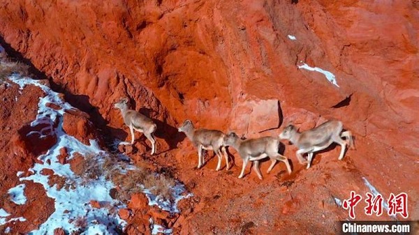 à la mi-décembre, dans le site touristique du Grand Canyon de Ten-zan, dans le comté de Kuqa de la région autonome ou?ghoure du Xinjiang (nord-ouest de la Chine), des groupes de moutons bleus se nourrissaient tranquillement sur la colline, ajoutant beaucoup de vitalité au site pittoresque du canyon en hiver.