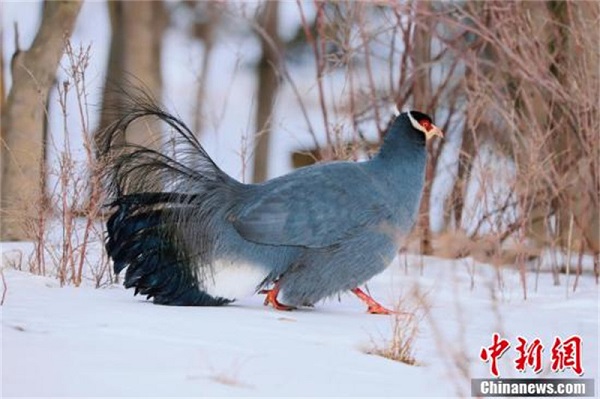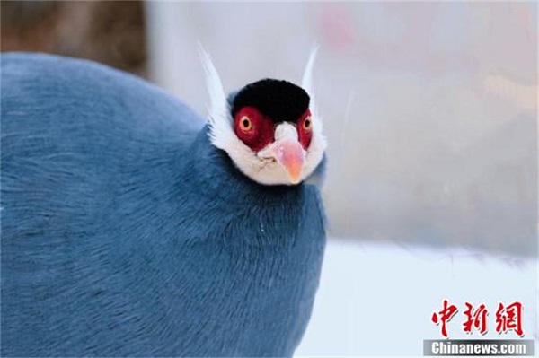 Le hokki bleu est un animal sauvage bénéficiant d'une protection clé nationale de deuxième classe. Avec son plumage aux couleurs vives, le hokki bleu se tient toujours dans une posture élégante. Le hokki bleu adulte mesure environ 95 cm de long, 55 cm de haut et pèse de 2 000 à 4 500 grammes. La couleur du corps du male et de la femelle est similaire, tout est bleu-gris. La peau du visage est nue, montrant une couleur rouge vif. Une autre caractéristique notable de l'oiseau est la grappe de plumes blanches auriculaires sur chaque c?té de sa tête. Sa queue comporte 24 plumes, dont les plumes centrales sont particulièrement longues et retroussées et les bords des plumes sont dispersés et tombants comme une prêle. Grace à ses pattes épaisses et puissantes, le hokki bleu est fort en course mais en revanche, en raison de son corps volumineux, de ses ailes courtes et de ses longues plumes de queue, il n'est pas doué pour voler. Il est principalement réparti dans le Sichuan, le Qinghai, le Gansu et le Ningxia, dans le sud-ouest et le nord-ouest de la Chine.