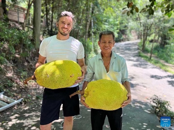 Le designer fran?ais Johannes Faure-Brac et un agriculteur présentent du jacquier fra?chement récolté à Zhongshan, dans la province du Guangdong (sud de la Chine), le 25 juillet 2023. (Photo / Xinhua)