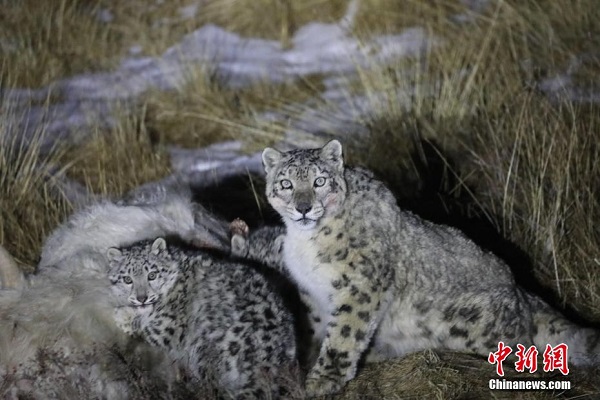 Récemment, dans le canton de Kharmar, district de Tianjun, préfecture autonome mongole et tibétaine de Haixi, province du Qinghai, un photographe a capturé trois léopards des neiges en train de manger à une courte distance. Sur la photo, trois léopards des neiges mangent un yak blanc. L'un des léopards des neiges, plus grand que les autres, a passé la plupart de son temps à ? observer ?. Les deux autres léopards des neiges étaient légèrement plus petits, mais ils ont ? profité d'un festin ? et sont partis ? joyeusement ? le ventre plein. Les léopards des neiges vivent principalement dans les zones de plateaux entre 2 500 et 5 000 mètres d'altitude. Ce sont des animaux protégés au niveau national de premier niveau et sont répertoriés comme espèces vulnérables par l'Union internationale pour la conservation de la nature (UICN). Parce qu'il voyage seul et que ses allées et venues sont secrètes, le léopard des neiges est également connu sous le nom d'? Ermite de la montagne enneigée ? et de ? Roi de la montagne enneigée ?.