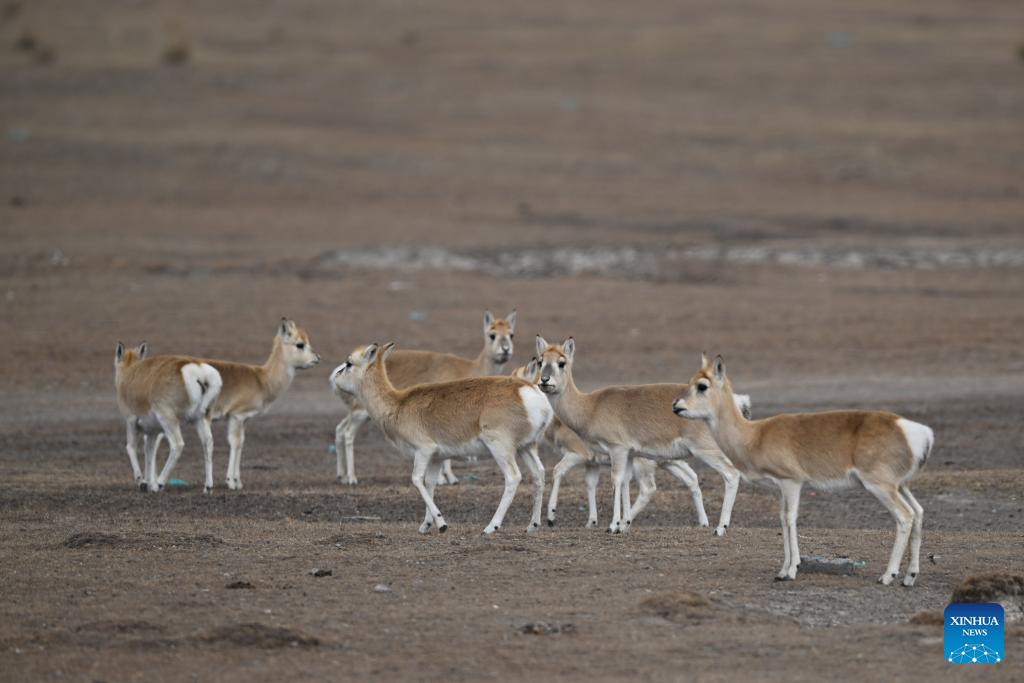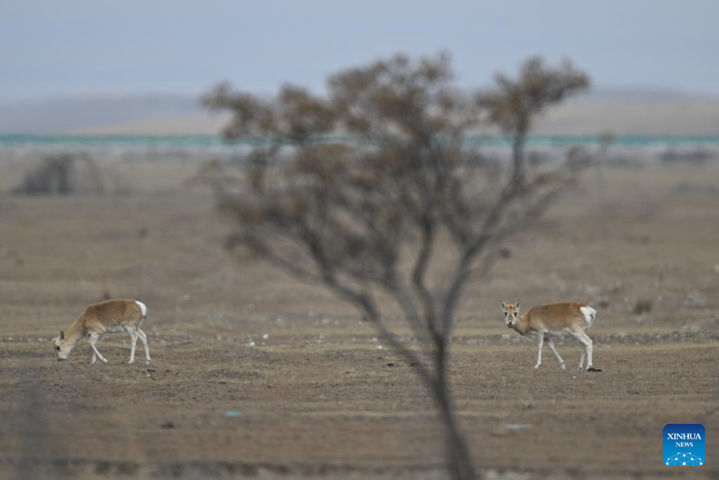 Des gazelles de Przewalski vues dans les prairies du canton de Ha'ergai du comté de Gangcha, dans la préfecture autonome tibétaine de Haibei de la province du Qinghai (nord-ouest de la Chine), le 16 novembre 2024. La zone entourant le lac Qinghai est le seul habitat des gazelles de Przewalski, une espèce qui bénéficie du plus haut niveau de protection en Chine. Grace aux efforts de conservation renforcés, le nombre de gazelles de Przewalski vivant dans le bassin du lac Qinghai est passé de 257 en 2004 à plus de 3 400.