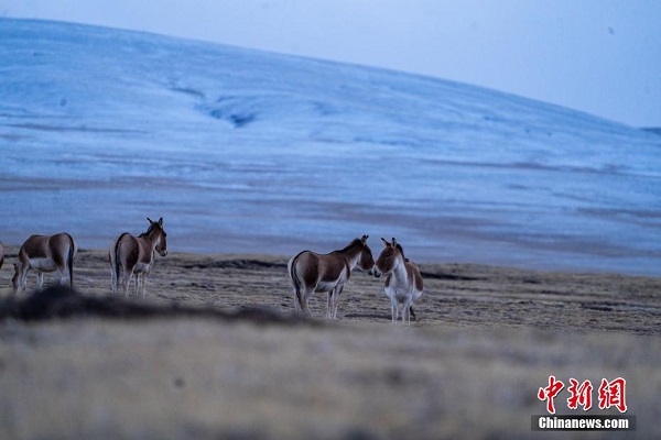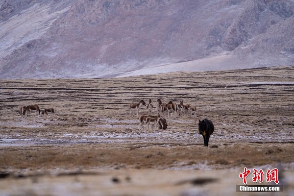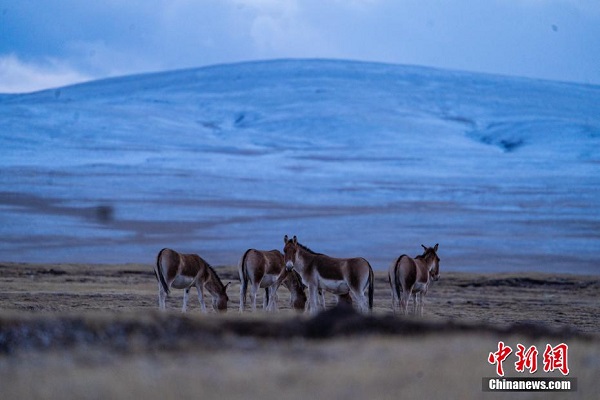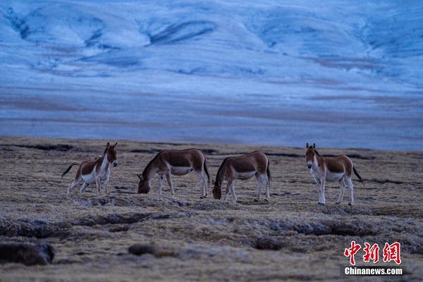 • Amdo, au Xizang : des anes sauvages tibétains en quête de nourriture dans les prairies du nord du Xizang