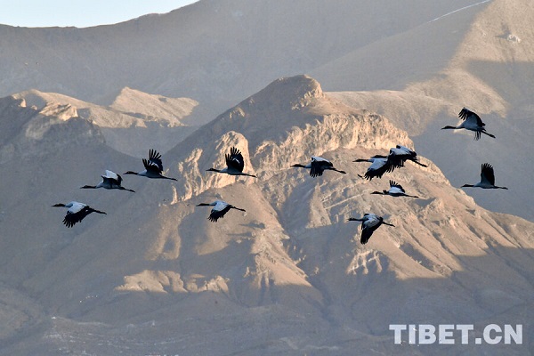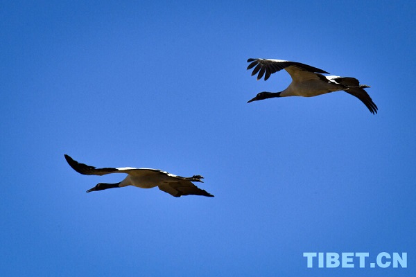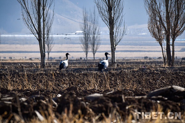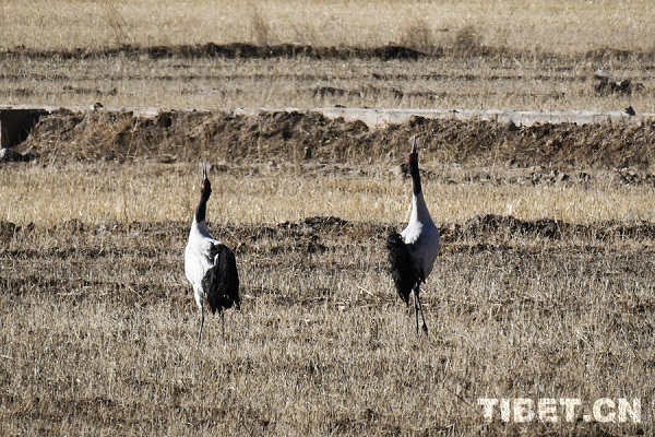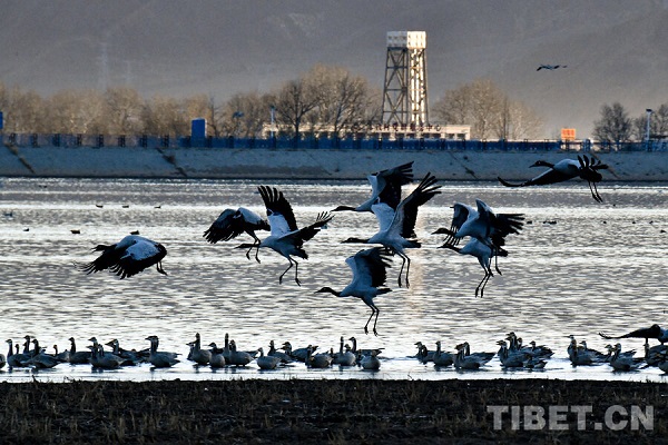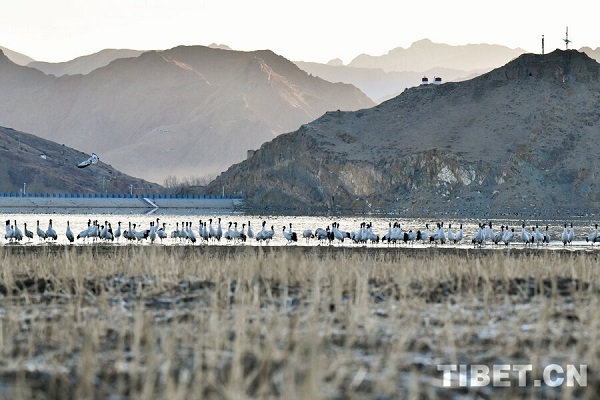 Classée espèce sauvage protégée de première catégorie nationale, la grue à cou noir, longue de 110 à 120 cm, est la seule parmi les 15 espèces de grues encore existantes dans le monde à vivre à haute altitude (2 500 à 5 000 m). Elle est connue sous les surnoms de ? fée du haut plateau ? et de ? panda géant des oiseaux ?. Chaque année, vers la fin octobre, les grues à cou noir arrivent progressivement pour hiverner dans la vallée du cours moyen du Yarlung Tsangpo et d'autres régions. Le 23 novembre, un journaliste a photographié un grand nombre de ces grues hivernantes dans le comté de Lhundrup, à Lhassa.