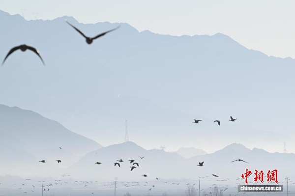 Dans la réserve naturelle de la grue à cou noir du district de Lünzhub, de la ville de Lhassa, au Xizang, des volées d'oiseaux migrateurs se rassemblent pour y passer l'hiver. Les zones humides, les terres agricoles et les réservoirs y forment un habitat idéal, attirant des myriades d'oiseaux migrateurs, tels que la grue à cou noir, l'oie à tête barrée et le tadorne casarca. Qu'ils planent dans le ciel ou qu'ils se nourrissent dans les champs, ces oiseaux composent un tableau vivant de l'écosystème du haut plateau.