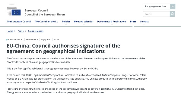Le Conseil de l'UE a publié une annonce indiquant que cet accord était le premier accord commercial bilatéral significatif signé entre l'UE et la Chine. Il veillera à ce que 100 indications géographiques de l'Union européenne et de la Chine soient protégées sur leurs marchés respectifs, garantissant ainsi le respect mutuel de leurs traditions agricoles. Les produits phares de l'Union européenne comprennent notamment le champagne, la feta et le whisky irlandais. L'annonce indiquait que quatre ans après l'entrée en vigueur de l'accord, son champ d'application serait élargi pour couvrir 175 appellations d'indication géographique supplémentaires de Chine et de l'UE.
