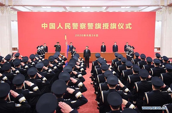 Lors de la cérémonie qui s'est tenue au Grand Palais du Peuple, à Beijing, M. Xi a remis le drapeau au ministre de la Sécurité publique Zhao Kezhi et au ministre de la S?reté de l'Etat Chen Wenqing. Plus de 300 policiers présents ont salué le drapeau.