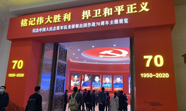 Le 19 octobre 1950, répondant à la requête de la République populaire démocratique de Corée, les forces de l'Armée des volontaires du peuple chinois ont franchi le fleuve Yalu à la frontière entre la Chine et la Corée du Nord, afin d'aider cette dernière dans la lutte jusqu'à ce qu'une trêve soit signée en 1953. Un total de 2,9 millions de soldats volontaires chinois sont entrés sur le champ de bataille et 197 653 d'entre eux ont sacrifié leur vie au cours de cette guerre.