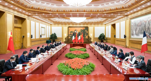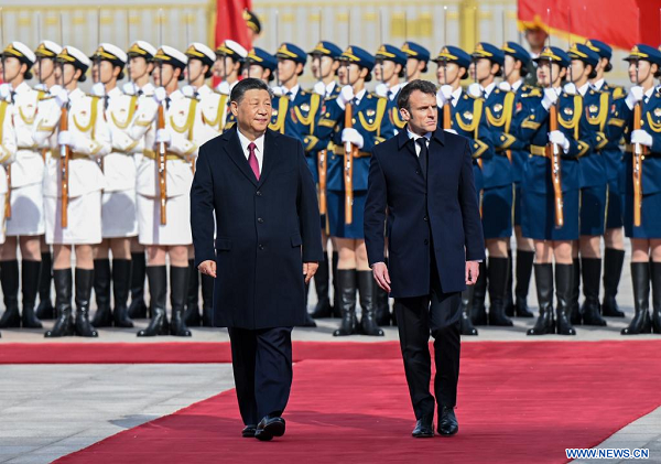 M. Xi a souhaité la bienvenue au président Emmanuel Macron pour cette visite d'Etat en Chine en plus de trois ans, indiquant que depuis ce temps, malgré le changement et l'instabilité de la situation internationale, la Chine et la France avaient travaillé ensemble pour maintenir un élan de croissance positif et solide dans leurs relations bilatérales.