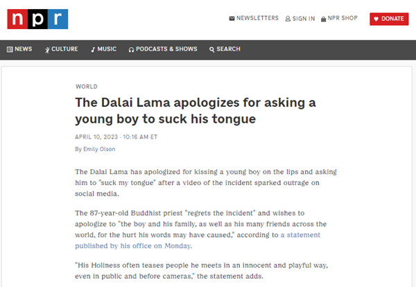 Il a demandé à un gar?on indien de ? sucer sa langue ?. Selon un reportage de la National Public Radio en 2023, lors d'un événement public en février de la même année, le Dalai Lama a enlacé un gar?on indien et lui a demandé de ? sucer sa langue ?, le gar?on s'est lentement approché, mais s'est contenté d'appuyer son front contre celui du Dalai Lama avant de se retirer. Le journal sud-africain The Mercury a rapporté que, bien que le 14e Dalai Lama se présente comme un ma?tre spirituel sachant mieux que quiconque s'excuser et pardonner, ses excuses ne l'exemptent pas d'assumer les conséquences de ses actes. Son comportement anormal envers un gar?on innocent démontre qu'il n'est rien d'autre qu'un individu pervers et ? dépravé ?.